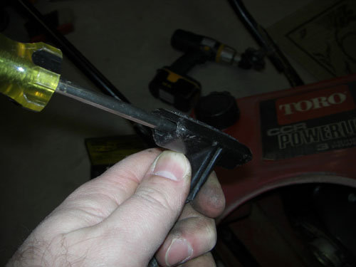 At this point you've discovered the wheel bracket and motor support are one and the same because the whole machine collapsed when you removed the bolts supporting the wheel. The pull-cord housing in mine was only held on by 3 screws (fortunately). I would not have been able to get the bottom screw without disassembling the bottom shell if that #4 screw were present. My guess is Toro omitted this screw for this very reason.